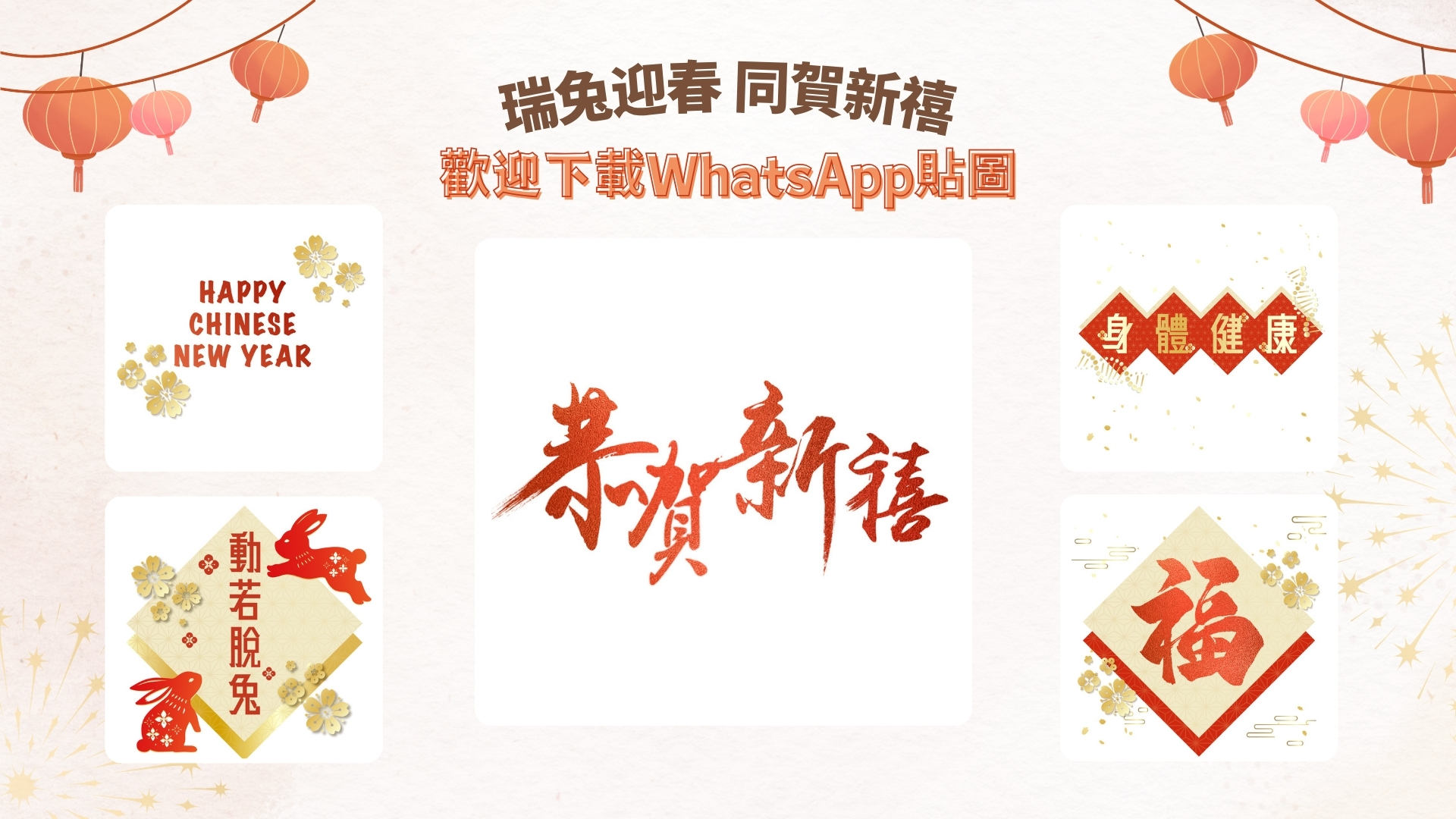 除了電子賀卡,基因組中心亦設計了一套五款的動態 WhatsApp 貼圖,以癸卯福兔、傳統剪紙、應節年花等圖案,配上不同祝福語,如「動若脫兔」、「身體健康」、「恭賀新禧」等,供市民大眾免費下載(連結),在新年時以貼圖向親朋好友拜年,傳遞喜悅和祝福。